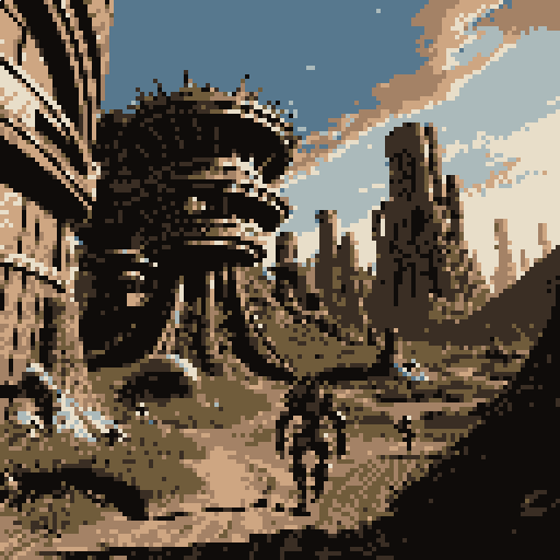 傑作、広がっている、荒廃した海岸の風景。ビーチは砂で構成されていない、しかし風化した、純粋な白のナノセラミック断片と塵、古代の超文明の残骸である。大きな、骨格の構造の、朽ちていく白いセラミックの塔とアーチが砂丘から昇る、それらは部分的に埋まっている。